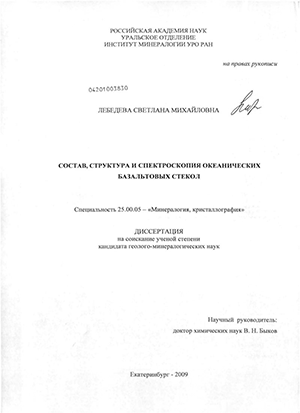 Актуальность темы. Природные стекла являются наиболее важными объектами, представляющими некристаллическое твердое вещество литосферы, и их исследование имеет большое значение для понимания закономерностей образования и эволюции минерального вещества Земли [Юшкин, 2001]. Базальтовые стекла образуются при подводном излиянии базальтовой магмы в условиях быстрого охлаждения при контакте с водой, и, как правило, существуют в виде корочек закалки подушечных лав. Отсутствие дальнего порядка в структуре стекол приводит к тому, что многие экспериментальные и теоретические методы исследования минерального вещества, развитые в первую очередь для кристаллов, не в полной мере применимы для исследования стекол.