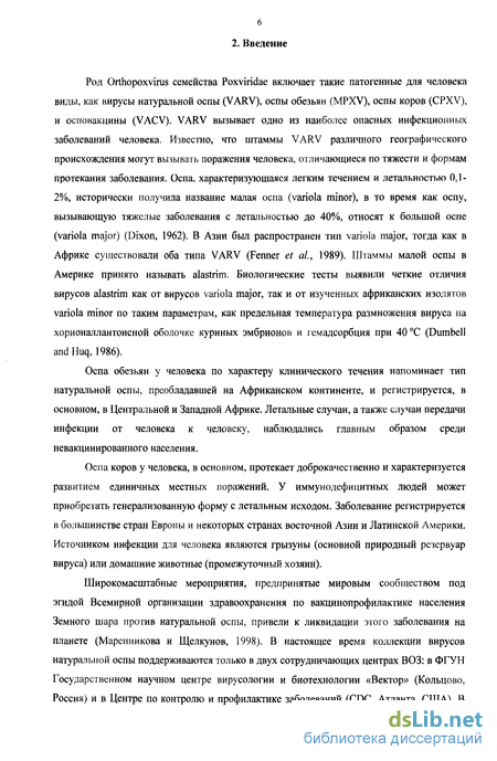 Род Orthopoxvirus семейства Poxviridae включает такие патогенные для человека виды, как вирусы натуральной оспы (VARV), оспы обезьян (MPXV), оспы коров (CPXV), и осповакцины (VACV). VARV вызывает одно из наиболее опасных инфекционных заболеваний человека. Известно, что штаммы VARV различного географического происхождения могут вызывать поражения человека, отличающиеся по тяжести и формам протекания заболевания. Оспа, характеризующаяся легким течением и летальностью 0,1-2%, исторически получила название малая оспа (variola minor), в то время как оспу, вызывающую тяжелые заболевания с летальностью до 40%, относят к большой оспе (variola major) (Dixon, 1962). В Азии был распространен тип variola major, тогда как в Африке существовали оба типа VARV (Fenner et al, 1989). Штаммы малой оспы в Америке принято называть alastrim. Биологические тесты выявили четкие отличия вирусов alastrim как от вирусов variola major, так и от изученных африканских изолятов variola minor по таким параметрам, как предельная температура размножения вируса на хорионаллантоисной оболочке куриных эмбрионов и гемадсорбция при 40 °С (Dumbell andHuq, 1986).