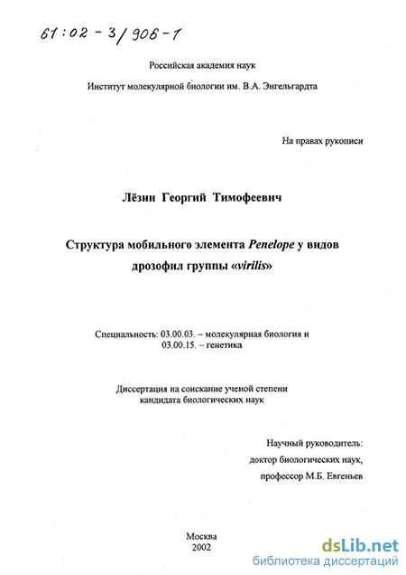 Лёзин Георгий Тимофеевич. Структура мобильного элемента Penelope у видов дрозофил группы "virilis" : диссертация ... кандидата биологических наук : 03.00.03, 03.00.15.- Москва, 2002.- 134 с.: ил. РГБ ОД, 61 02-3/906-1