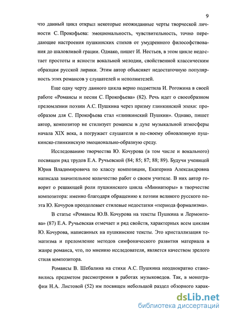 Упомянутые работы, безусловно, стали весомым вкладом в музыкальную пушкинистику. Однако стоит подчеркнуть, что к настоящему моменту целостных исследований, раскрывающих всю панораму развития камерно-вокального жанра в 30-е годы ХХ века, не проводилось. Помимо того, подробный анализ влияния пушкинского творчества на формирование советского классического романса, в научной литературе до сих пор места не имел.