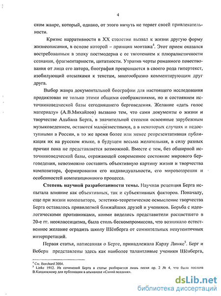 Выбор жанра документальной биографии для настоящего исследования продиктован не только этими общими соображениями, но и состоянием отечественного берговедения. Желание «дать голос материалу» (А.В.Михайлов) вызвано тем, что сами документы о жизни и творчестве Альбана Берга, в значительной степени освоенные зарубежным музыковедением, остаются малоизвестными, а в некоторых случаях и недоступными в России, в то же время более или менее репрезентативная публикация их на русском языке, в будущем весьма желательная, в силу разных причин пока не представляется возможной. Вместе с тем без обширной источниковедческой базы, отражающей современное состояние мирового берговедения, невозможно составить объективную и достоверную картину жизни и творчества композитора, формирования его индивидуальности, его мировоззрения, эстетических взглядов, особенностей композиционного процесса.