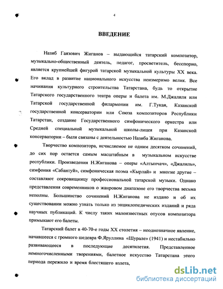 Во Введении излагаются цели и задачи исследования, обосновывается его актуальность, формулируются основные методы исследования. Освещение главных тенденций развития отечественного балетного театра в 30-70-е годы позволяет выявить их непосредственное влияние на формирование и развитие татарского балета в целом и балетного творчества Н.Жиганова в частности. Искания композитора в области музыкального
