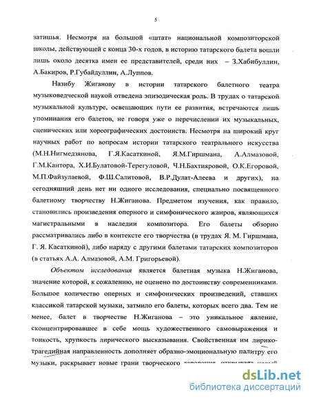 Объектом исследования является балетная музыка Н.Жиганова, значение которой, к сожалению, не оценено по достоинству современниками. Большое количество оперных и симфонических произведений, ставших классикой татарской музыки, затмило его балеты, которых всего два. Тем не менее, балет в творчестве Н.Жиганова - это уникальное явление, сконцентрировавшее в себе мощь художественного самовыражения и тонкость, хрупкость лирического высказывания. Свойственная им лирико-трагедийная направленность дополняет образно-эмоциональную палитру его музыки, раскрывает новые грани творческого дарования, открывает новый
