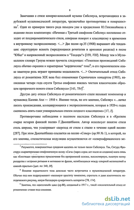 Замечания о стиле камерно-вокальной музыки Сибелиуса, встречающиеся в зарубежной музыковедческой литературе, чрезвычайно противоречивы и поверхностны7. Один из примеров такого рода находим уже в предисловии Ю.Тииликайнена к изданию песен композитора: «Начиная с Третьей симфонии Сибелиус постепенно отходит от позднеромантического стиля, совершая поворот к классицизму и временами к внутреннему экспрессионизму. ... Две песни ор.35 (1908) выражают обе тенденции: структурную ясность (чередующиеся речитатив и ариозные разделы) в песне "Юбал" и напряженный экспрессионизм в "Теодоре"» [359, VIII]. Между тем в Музыкальном словаре Гроува можно прочесть следующее: «Тематизм произведений Сибе о лиуса обычно окрашен в характерные "нордические" тона ; в его гармоническом языке заметную роль играют принципы модальности. ... Окончательный отход Сибелиуса от романтизма XIX века был ознаменован Скрипичным концертом (1903), написанная четыре года спустя Третья симфония явилась чистым классическим образцом прозрачного нового стиля Сибелиуса» [145, 784]9.
