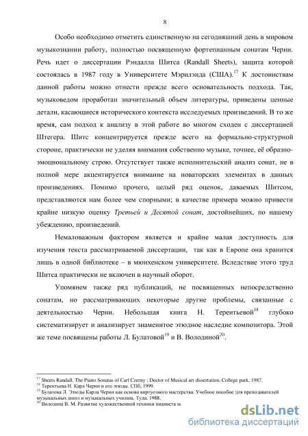Особо необходимо отметить единственную на сегодняшний день в мировом музыкознании работу, полностью посвященную фортепианным сонатам композитора - диссертацию Рэндалла Шитса (Randall Sheets)9. Музыковедом проработан значительный объем литературы, приведена ценная информация, касающаяся исторического контекста исследуемых произведений. В то же время, анализ фортепианных сонат в этой работе отличается поверхностным, формальным характером. Рэндалл Шитс недостаточно объективно оценивает художественные достоинства произведений Черни, высказывая подчас излишне радикальные, бездоказательные утверждения об их незначительной эстетической ценности.