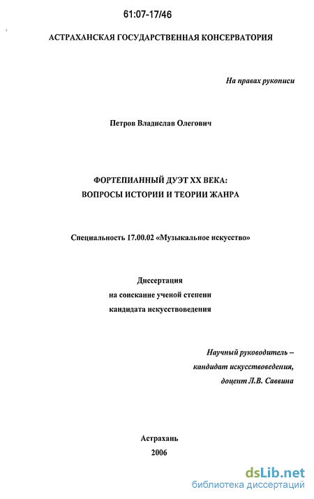В современной ситуации развития научной мысли о жанре фортепианного дуэта важными представляются также кандидатские диссертации Н. Катоновой «Ансамбль двух фортепиано в XX веке. Типология жанра» [58] и О. Гринес «Жанр фортепианного ансамбля и его воплощение в творчестве И. Стравинского и Н. Метнера» [35].