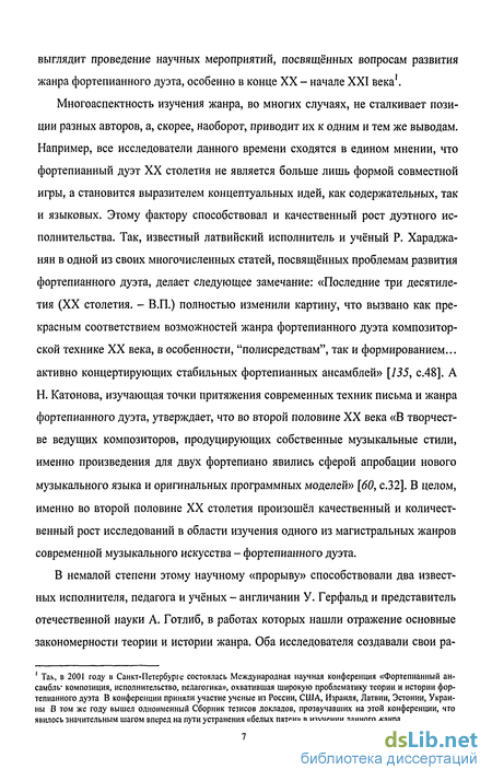 Многоаспектность изучения жанра, во многих случаях, не сталкивает позиции разных авторов, а, скорее, наоборот, приводит их к одним и тем же выводам. Например, все исследователи данного времени сходятся в едином мнении, что фортепианный дуэт XX столетия не является больше лишь формой совместной игры, а становится выразителем концептуальных идей, как содержательных, так и языковых. Этому фактору способствовал и качественный рост дуэтного исполнительства. Так, известный латвийский исполнитель и учёный Р. Хараджа-нян в одной из своих многочисленных статей, посвященных проблемам развития фортепианного дуэта, делает следующее замечание: «Последние три десятилетия (XX столетия. - В.П.) полностью изменили картину, что вызвано как прекрасным соответствием возможностей жанра фортепианного дуэта композиторской технике XX века, в особенности, "полисредствам", так и формированием... активно концертирующих стабильных фортепианных ансамблей» [135, с.48]. А Н. Катонова, изучающая точки притяжения современных техник письма и жанра фортепианного дуэта, утверждает, что во второй половине XX века «В творчестве ведущих композиторов, продуцирующих собственные музыкальные стили, именно произведения для двух фортепиано явились сферой апробации нового музыкального языка и оригинальных программных моделей» [60, с.32]. В целом, именно во второй половине XX столетия произошёл качественный и количественный рост исследований в области изучения одного из магистральных жанров современной музыкального искусства - фортепианного дуэта.