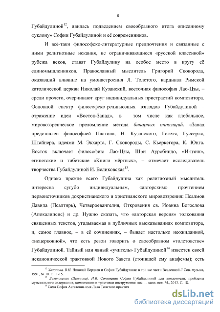 Говоря о существенной разности понятий «религиозность» и «церковность» в отношении Губайдулиной, И. Великовская приводит следующие е слова: «Чтобы быть по-настоящему церковным человеком, надо быть в послушании… Как художник я, наоборот, протестный тип. Я не могу принять послушание как жизненный принцип»54. И, следом, «комментарий» Н. Бердяева: «Смысл жизни и бытия не исчерпывается искуплением греха, … жизнь и бытие имеют положительные, творческие задачи»55. Нам же на память приходит математически ясная формула В. Набокова: «Христос минус церковь» (о позднем мировоззрении позднего Толстого, иначе говоря, о «толстовстве»).