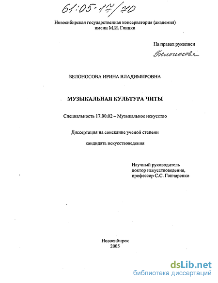 На сегодняшний день отдельным частным вопросам истории музыкальной культуры Читы посвящены две специальные публикации. Так, брошюра В.А. Михайлова «Великорусские оркестры в Забайкалье» [149], имеющая научно-популярный характер (автор ее - журналист), содержит обзор коллективов Читы с 1910 до начала 1990-х гг. В статье В.А. Королевой «У истоков» [124] — первой музыковедческой работе о музыкальной культуре города - освещается концертная деятельность замечательных музыкантов — преподавателей Народной консерватории, существовавшей в 1920 - 1922 тт. В 1990-х - начале 2000-х гг. появляются работы по фольклору, в том числе диссертация Т.М. Зенковой на соискание научной степени кандидата культурологии «Народно-песенная культура семейских Восточного Забайкалья (историко-культурологический анализ)» [106].