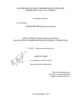 Цель работы — систематизировать особенности оркестрового стиля симфоний Брукнера, изучить его генезис, структуру, содержательно-смысловое наполнение и воздействие на последующую историю западноевропейского симфонизма.