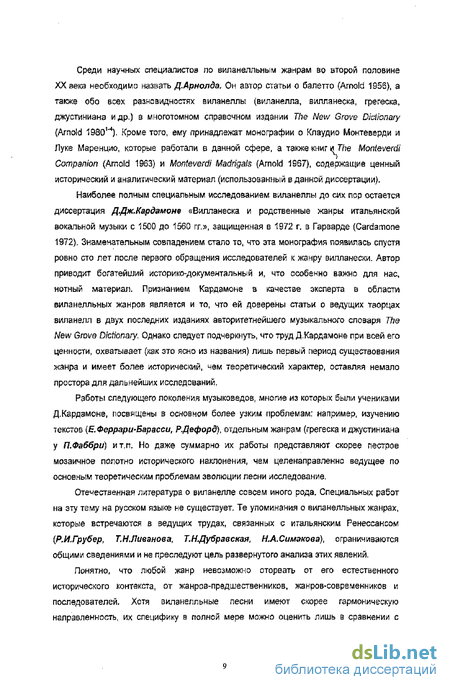 Среди научных специалистов по виланелльным жанрам во второй половине XX века необходимо назвать Д,Арнолда, Он автор статьи о балетто (Arnold 1956), а также обо всех разновидностях виланеллы (виланелла, вилланеска, грегеска, джустиниана и др.) в многотомном справочном издании 7/ЇЄ New Grove Dictionary {Arnold 1980м). Кроме того, ему принадлежат монографии о Клаудио Монтеверди и Луке Маренцио, которые работали в данной сфере, а также книг И7Ї7Є Monteverdi Companion (Arnold 1963) и Monteverdi Madrigals (Arnold 1967), содержащие ценный исторический и аналитический материал (использованный в данной диссертации).
