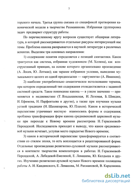 Намеченный комплекс задач можно разделить на три группы. К одной группе относятся проблемы, связанные с каноном, который в ходе исторического развития меняет облик и способы оформления. Отдельную группу образуют вопросы, относящиеся к формам проявления ав торского начала. Третья группа связана со спецификой претворения канонической модели в творчестве Рахманинова. Избранная группировка задач предваряет структуру работы.