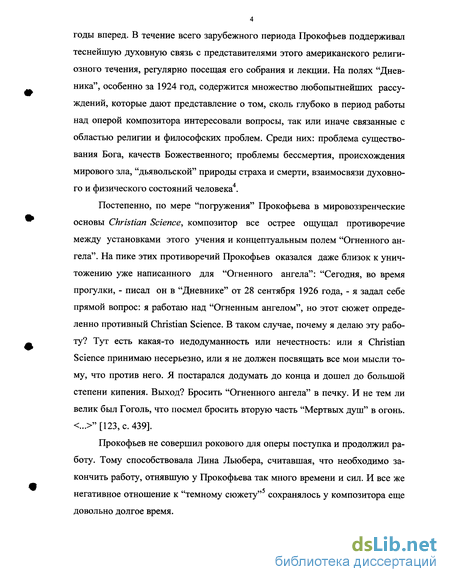 годы вперед. В течение всего зарубежного периода Прокофьев поддерживал теснейшую духовную связь с представителями этого американского религиозного течения, регулярно посещая его собрания и лекции. На полях "Дневника", особенно за 1924 год, содержится множество любопытнейших рассуждений, которые дают представление о том, сколь глубоко в период работы над оперой композитора интересовали вопросы, так или иначе связанные с областью религии и философских проблем. Среди них: проблема существования Бога, качеств Божественного; проблемы бессмертия, происхождения мирового зла, "дьявольской" природы страха и смерти, взаимосвязи духовного и физического состояний человека4.
