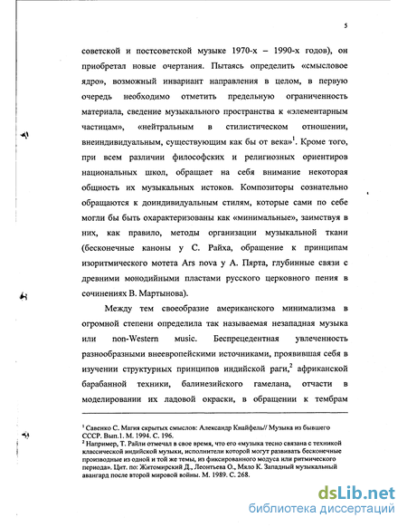 советской и постсоветской музыке 1970-х - 1990-х годов), он приобретал новые очертания. Пытаясь определить «смысловое ядро», возможный инвариант направления в целом, в первую очередь необходимо отметить предельную ограниченность материала, сведение музыкального пространства к «элементарным частицам», «нейтральным в стилистическом отношении, внеиндивидуальным, существующим как бы от века»1. Кроме того, при всем различии философских и религиозных ориентиров национальных школ, обращает на себя внимание некоторая общность их музыкальных истоков. Композиторы сознательно обращаются к доиндивидуальным стилям, которые сами по себе могли бы быть охарактеризованы как «минимальные», заимствуя в них, как правило, методы организации музыкальной ткани (бесконечные каноны у С. Райха, обращение к принципам изоритмического мотета Ars nova у А. Пярта, глубинные связи с древними монодииными пластами русского церковного пения в сочинениях В. Мартынова).