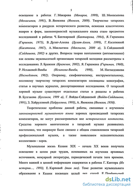 Степень изученности проблемы. Татарская музыка - устной традиции и профессиональная - исследована широко и многоаспектно. Изучение татарских народных песен началось еще в дореволюционное время (В. Мошков, А. Риттих, С. Рыбаков) и активно продолжилось в XX веке, особенно в последней трети столетия и в начале XXI века -А. Абдуллин, Р. Исхакова-Вамба, М. Нигмедзянов, 3. Сайдашева, Е. Смирнова, Дж. Файзи, Ш. Шарифуллин и др. Народная инструментальная культура татар, в том числе ансамблевая, нашла освещение в работах Г. Макарова, Ш. Монасыпова, В. Яковлева. Творчество татарских композиторов в ракурсах исторического развития, освоения классических жанров и форм, закономерностей музыкального языка стало предметом исследований в работах Ч. Бахтияровой, Я. Гиршмана, В. Дулат-Алеева, Г. Касаткиной, А. Маклыгина, 3. Сайдашевой и др. Вопросы теории пентатоники (ангемитоники) как основы звуковысотной организации татарской мелодики рассмотрены в исследованиях Л. Бражник, Я. Гиршмана, Р. Исхаковой-Вамбы, М. Нигмедзянова и др. Оперному, симфоническому, инструментальному, песенному творчеству татарских композиторов посвящены монографии, статьи в научных журналах, диссертационные исследования. О татарской хоровой музыке существуют отдельные статьи и разделы в работах В. Булгакова, Г. Вайды-Сайдашевой, 3. Хайруллиной, А. Яковлева.