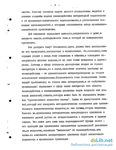 Как раскрыть тему? Несомненно, здесь должны быть использованы все предпосылки,накопленные в музыкознании. Но,поскольку,тема корнями уходит в сверх тему понимания и общения,а последнее исследовалось многими науками,то их опыт также нуждается в претво і рении. Поэтому в сферу интересов диссертации входят не только литература и музыка,но и науки,способные осветить проблему их взаимодействия - от сравнительного литературоведения до теории межъязыковой коммуникации.Пограничность темы исследования (включающий проблематику не только лишь литературную,и не собственно музыкальную) определяет и сферу наших интересов: это область взаимодействия и взаимовлияния различных видов искусств как язы-ковых данностей, область,которую можно было бы определить яерми-ном "сравнительное искусство/знание". Одним из краеугольных камней,который мог послужить методологическим основанием для сравнительного искусствознания является,на наш взгляд,теория перевода. Конечно же,музыкальная интерпретация литературного оригинала в контексте данной работы не отождествляется с переводом в прямом смысле. Что может дать сама идея переводимости? Прежде всего -это критерий для сравнивания односюжетных произведений различных видов искусства,основание "механизма" их взаимодействия,ибо какие-то компоненты литературного оригинала будут обязательно перенесены в музыкальное произведение (в силу особенностей орга низации человеческого мышления и восприятия),также закономерно и существование причин (объективного и субъективного характера), препятствующих полному объёму перевоплощения литературного сюжета на музыкальной сцене.