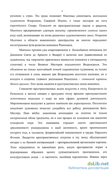 Введение формулирует главную идею диссертации о том, что пространство картины именно для Мантеньи становится важнейшей формальной характеристикой художественного произведения и основным выразительным средством построения образа, поскольку в его работах осмысляются, сплавляются воедино и переходят на новый качественный уровень основные пространственные идеи Кватроченто, а именно - структурный пространственно-пластический принцип искусства Тосканы и декоративно-интегрирующее начало в живописи мастеров итальянского Севера, Ломбардии и Венет