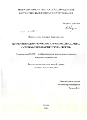 Научная новизна исследования. Соотнесение творческого пути, особенностей восприятия и воплощения природы мастерами, эстетико-мировоззренческого «среза» их искусства в качестве предмета специального исследования ранее не предлагалось. Данная работа представляет собой попыт- ку рассмотрения творчества Кузнецова и Сарьяна в широком контексте одной из основополагающих тенденций эпохи - темы взаимоотношения природы, человека и Космоса.