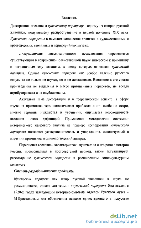 Диссергация посвящена купеческому портрету - одному из жанров русской живописи, получившему раснросгранение в первой половине XIX века Купеческие портреты в немалом количестве хранятся в художественных и краеведческих, столичных и периферийных музеях.