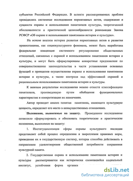 Теоретическая и практическая значимость. В работе предложен системный подход к определению понятий «памятник истории и культуры» и «государственная охрана и использование памятников истории и культуры» в связи с процессом институализации нормативного регулирования, обоснованы принципы классификации памятников истории и культуры, выявлена взаимозависимость развития общественного сознания (правосознания) и социокультурной среды, выявлены пробелы в законодательстве, нечеткие положения нормативных актов.