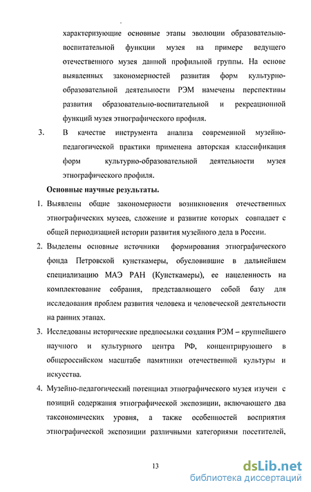 Музейно-педагогический потенциал этнографического музея изучен с позиций содержания этнографической экспозиции, включающего два таксономических уровня, а также особенностей восприятия этнографической экспозиции различными категориями посетителей,
