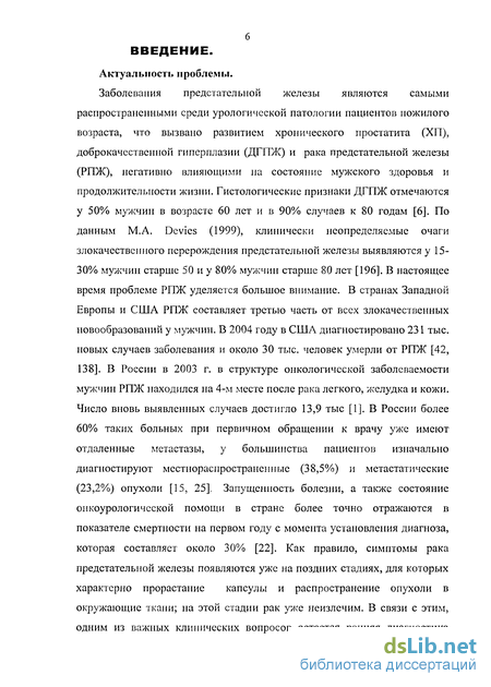 Заболевания предстательной железы являются самыми распространенными среди урологической патологии пациентов пожилого возраста, что вызвано развитием хронического простатита (ХП), доброкачественной гиперплазии (ДГПЖ) и рака предстательной железы (РПЖ), негативно влияющими на состояние мужского здоровья и продолжительности жизни. Гистологические признаки ДГПЖ отмечаются у 50% мужчин в возрасте 60 лет и в 90% случаев к 80 годам [6]. По данным М.А. Devies (1999), клинически неопределяемые очаги злокачественного перерождения предстательной железы выявляются у 15-30% мужчин старше 50 и у 80% мужчин старше 80 лет [196]. В настоящее время проблеме РПЖ уделяется большое внимание. В странах Западной Европы и США РПЖ составляет третью часть от всех злокачественных новообразований у мужчин. В 2004 году в США диагностировано 231 тыс. новых случаев заболевания и около 30 тыс. человек умерли от РПЖ [42, 138]. В России в 2003 г. в структуре онкологической заболеваемости мужчин РПЖ находился на 4-м месте после рака легкого, желудка и кожи. Число вновь выявленных случаев достигло 13,9 тыс [1]. В России более 60% таких больных при первичном обращении к врачу уже имеют отдаленные метастазы, у большинства пациентов изначально диагностируют местно-распространенные (38,5%) и метастатические (23,2%) опухоли [15, 25]. Запущенность болезни, а также состояние онкоурологической помощи в стране более точно отражаются в показателе смертности на первом году с момента установления диагноза, которая составляет около 30% [22]. Как правило, симптомы рака предстательной железы появляются уже на поздних стадиях, для которых характерно прорастание капсулы и распространение опухоли в окружающие ткани; на этой стадии рак уже неизлечим. В связи с этим, одним из важных клинических вопросов остается ранняя диагностика этого заболевания, так как до сих пор высок процент его позднего выявления (в стадии распространенных метастазов) [117, 204]. Основная трудность ранней диагностики: дифференциальная диагностика рака предстательной железы с доброкачественной гиперплазией, простатитом и др. заболеваниями, сопровождающимися расстройствами мочеиспускания. Велик удельный вес сочетания рака простаты с доброкачественной гиперплазией предстательной железы (ДГПЖ) и хроническим простатитом, что снижает чувствительность, специфичность и точность таких известных методов обследования, как ПСА, пальцевое ректальное обследование простаты (ПРИ), УЗИ и/или ТРУЗИ, биопсии предстательной железы.