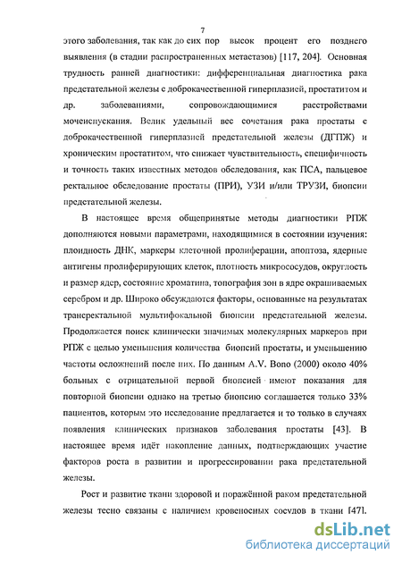В настоящее время общепринятые методы диагностики РПЖ дополняются новыми параметрами, находящимися в состоянии изучения: плоидность ДНК, маркеры клеточной пролиферации, апоптоза, ядерные антигены пролиферирующих клеток, плотность микрососудов, округлость и размер ядер, состояние хроматина, топография зон в ядре окрашиваемых серебром и др. Широко обсуждаются факторы, основанные на результатах трансректалыюй мультифокальной биопсии предстательной железы. Продолжается поиск клинически значимых молекулярных маркеров при РПЖ с целью уменьшения количества биопсий простаты, и уменьшению частоты осложнений после них. По данным A.V. Bono (2000) около 40% больных с отрицательной первой биопсией имеют показания для повторной биопсии однако на третью биопсию соглашается только 33% пациентов, которым это исследование предлагается и то только в случаях появления клинических признаков заболевания простаты [43]. В настоящее время идёт накопление данных, подтверждающих участие факторов роста в развитии и прогрессировании рака предстательной железы.