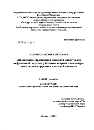 Обоснование положения о том, что улучшение клинического течения острого гнойного пиелонефрита достигается благодаря коррекции почечной ишемии с помощью инфузии янтарной кислоты, что подтверждено достоверным снижением активности ферментов и содержания продуктов гликолиза, и активности процессов ПОЛ