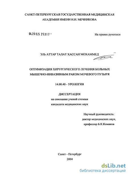 Внедрение в практику результатов исследования. Разработанные в диссертации тактические и технические решения при оперативном лечении больных мышечно-инвазивным РМП внедрены в клиническую практику урологических отделений городских больниц №№ 2, З, ЦМСЧ № 122 Санкт-Петербурга, клиники урологии Санкт-Петербургской государственной медицинской академии имени И.И. Мечникова.