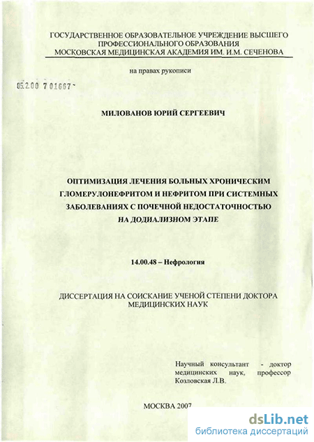 Апробация работы проведена на совместном заседании кафедры терапии и профессиональных болезней медико-профилактического факультета, кафедры нефрологии и гемодиализа ФППОВ, отдела нефрологии НИЦ ММА им. И.М. Сеченова 7 сентября 2006 г.