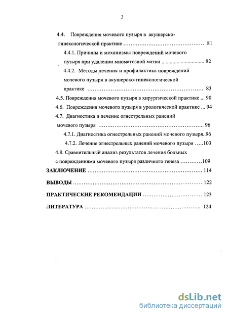 За последние 10 лет вопросам повреждений мочевого пузыря посвящены отдельные публикации с незначительным количеством наблюдений, небольшие разделы в некоторых монографиях и руководствах и одна диссертационная работа А.В. Щекочихина (2003), выполненная по материалам современных военных конфликтов и посвящена только огнестрельным сочетан-ным ранениям мочевого пузыря.