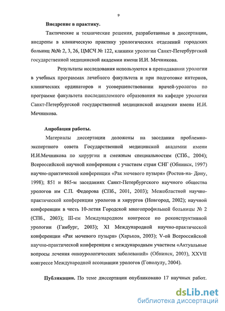 Материалы диссертации доложены на заседании проблемно-экспертного совета Государственной медицинской академии имени И.И.Мечникова по хирургии и смежным специальностям (СПб., 2004); Всероссийской научной конференции с участием стран СНГ (Обнинск, 1997) научно-практической конференции «Рак мочевого пузыря» (Ростов-на- Дону, 1998); 851 и 865-м заседаниях Санкт-Петербургского научного общества урологов им СП. Федорова (СПб., 2001, 2003); Межобластной научно-практической конференции урологов и хирургов (Новгород, 2002); научной конференции в честь 10-летия Городской многопрофильной больницы № 2 (СПб., 2003); Ш-ем Международном конгрессе по реконструктивной урологии (Гамбург, 2003); XI Международной научно-практической конференции «Рак мочевого пузыря» (Харьков, 2003); V-ой Всероссийской научно-практической конференции с международным участием «Актуальные вопросы лечения онкоурологических заболеваний» (Обнинск, 2003), XXVII конгрессе Международной ассоциации урологов (Гонолулу, 2004).