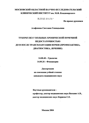 Диссертационная работа выполнена в отделении хронического гемодиализа и трансплантации почки МОНИКИ им. М.Ф. Владимирского (директор - член-корр. РАМН, заслуженный деятель науки РФ, проф. Г.А. Оноприенко).