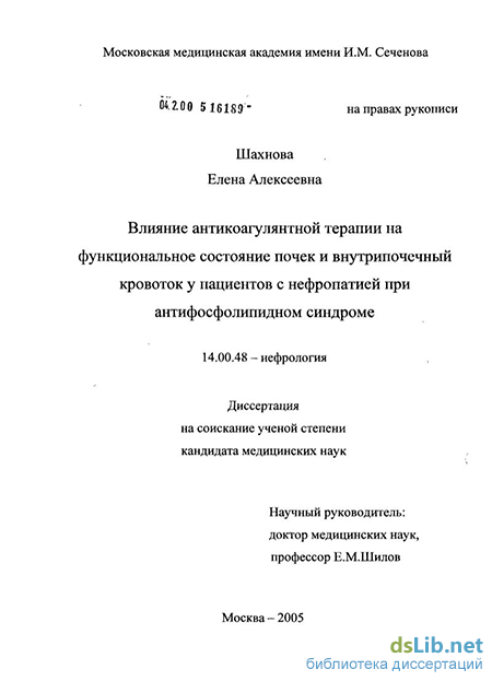 Описапный около 20 лет назад антифосфолипидный синдром (АФС) в настоящее время рассматривают как хроническое заболевание, в основе которого лежит тромбоокклюзивное поражение сосудов разного калибра, приводящее к полиорганной ишемии. Исследованиями последних лет показано, что при АФС почки являются одним из основных органов-мишеней [Piette J.C., 1996; Nochy D., 1999; Daugas В., 2002]. Поражение почек в рамках АФС многообразно, однако наиболее часто встречается форма, получившая название АФС-ассоциированной нефропатии (АФСН), которая характеризуется сочетанием острых и хронических вазоокклюзивных изменений в микроциркуляторном русле почек [Nochy D., 1999]. Острые изменения АФСН представлены тромбозами артериол и капилляров (тромботическая микроангиопатия), хронические - артерио- и артериолосклерозом и фиброзом сосудистой стенки. Тромботическая и фиброзная окклюзия внутрипочечных сосудов приводит к нарушению перфузии и выраженной ишемии почек, клинически проявляющейся артериальной гипертензией, нарушением функции почек и мочевым синдромом. При естественном течении АФС-нефропатия отличается неблагоприятным прогнозом: 10-летняя почечная выживаемость составляет 50%; в то же время лечение антикоагулянтами оказалось единственным фактором, улучшавшим прогноз больных АФСН [Метелева Н.А., 2004]. Общепринятых подходов к лечению АФС-нефропатии не разработано. Имеются лишь единичные описания пациентов, лечение которых включало, наряду с другими препаратами, антикоагулянты, как правило, непрямые [Bridoux F., 1998; Козловская Н.Л., 2001; Scully R.E., 2001]. Показания к назначению антикоагулянтной терапии больным АФСН не определены, не установлены продолжительность лечения и дозы препаратов. В связи с чем изучение этих вопросов является актуальным.