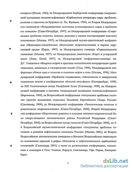 Апробация работы. Теоретические, методические и практические результаты исследований докладывались на Всесоюзной конференции «Геодинамические основы прогнозирования нефтегазоносности недр» (Москва, 1988), Международной геофизической конференции (Москва/ 1992), Международном симпозиуме «Нетрадиционные источники углеводородов» (Санкт-Петербург, 1992), Всероссийской геологической конференции «Геология и минерально-сырьевые ресурсы Европейского северо-востока» (Сыктывкар, 1994), XXX Международном Геологическом конгрессе (Пекин, 1996), на Международной Хадбергской конференции Американской ассоциации геологов-нефтяников «Карбонатные резервуары мира: проблемы, решения и стратегии на будущее» (г. По, Франция, 1996), на Втором Международ ном симпозиуме «Нетрадиционные источники углеводородного сырья и проблемы его освоения» (Санкт-Петербург, 1997), на Международной конференции «Современные проблемы геологии, поисков, разведки и оценки месторождений полезных ископаемых» (Москва, 1997), на Международной научно-практической конференции «Инженерно-геологическое обеспечение недропользования и охраны окру жающей среды» (Пермь, 1997), на Международном семинаре «Горизонтальные скважины» (Москва, 1997), на Международном симпозиуме «Карст и углеродный цикл» (Липу, Китай, 1997), на Международной конференции-семинаре им. Д.Г. Успенского «Вопросы теории и практики геологической интерпретации гравитационных, магнитных и электрических полей» (Ухта, 1998), Международной конференции «Новые идеи в геологии и геохимии нефти и газа» (Москва, 1998), Международной конференции «Проблемы геодинамики, сейсмичности и минерагении подвижных поясов и платформенных областей литосферы» (Екатеринбург, 1998), на XIII Геологическом съезде Республики Коми (Сыктывкар, 1999), на Международной конференции и выставке Американской ассоциации геологов-нефтяников (Бирмингем, 1999), на Всероссийской конференции «Актуальные проблемы геологии горючих ископаемых осадочных бассейнов Европейского Севера России» (Сыктывкар, 2000), на Международной конференции «Экологическая геология и рациональное недропользование» (Санкт-Петербург, 2000), Второй Международ ф ной конференции «Перспективы развития и освоения топливно-энергетической ба зы северо-западного экономического района Российской Федерации» (Санкт-Петербург, 2000), на Всероссийском съезде геологов (Санкт-Петербург, 2000), на 4-й Всероссийской научно-технической конференции «Актуальные проблемы состояния и развития нефтегазового комплекса России» (Москва, 2001), на Втором Всероссийском литологическом совещании и Восьмом Всероссийском симпозиуме по ископаемым кораллам и рифам «Литология и нефтегазоносность карбонатных ф отложений» (Сыктывкар, 2001), а также на региональных конференциях, совеща ниях и семинарах в Ухте, Усинске, Воркуте, Сыктывкаре, Уфе, Перми, Екатеринбурге. Публикации. По теме диссертации опубликовано 87 работ, в том числе 2 монографии, 1 учебное пособие, 1 брошюра, 1 авторское свидетельство и 1 патент на изобретение (в соавторстве). Основные защищаемые положения: