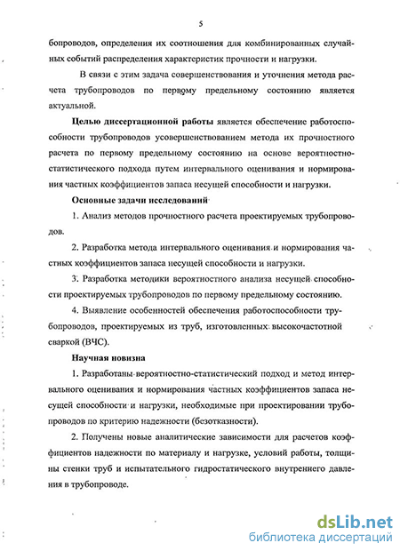 Целью диссертационной работы является обеспечение работоспособности трубопроводов усовершенствованием метода их прочностного расчета по первому предельному состоянию на основе вероятностно-статистического подхода путем интервального оценивания и нормирования частных коэффициентов запаса несущей способности и нагрузки.