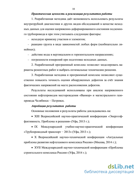 Программный комплекс позволяет моделировать варианты ремонт-ных работ и выбрать оптимальные решения. 4. Рассмотрен пример расчёта НДС на одном из участков магистраль-ного нефтепровода, который показал эффективность разработанной методи-ки.