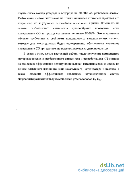 случае смесь оксида углерода и водорода на 50-60% об. разбавлена азотом. Разбавление азотом синтез-газа не только понижает стоимость процесса его получения, но и улучшает теплообмен в системе. Однако ФТ-синтез на основе разбавленного синтез-газа целесообразно проводить, если превращение СО за проход составляет не менее 95-98%. Это предъявляет жёсткие требования к свойствам используемых каталитических систем, которые для этого должны будут одновременно обеспечивать указанное превращение СО при достаточно высоком выходе жидких продуктов.