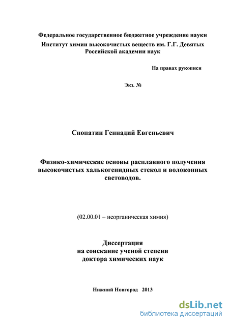 Целью данной работы является развитие физико-химических основ и способов расплавного получения халькогенидных стекол с более высокой, чем ранее, степенью химической и фазовой чистоты и волоконных световодов из них с малыми оптическими потерями.