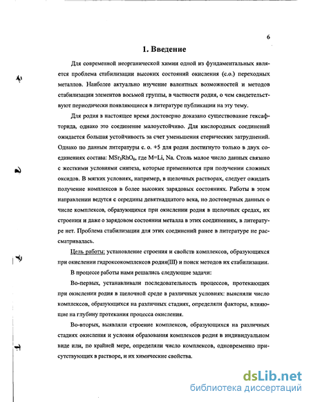 Для современной неорганической химии одной из фундаментальных является проблема стабилизации высоких состояний окисления (со.) переходных металлов. Наиболее актуально изучение валентных возможностей и методов стабилизации элементов восьмой группы, в частности родия, о чем свидетельствуют периодически появляющиеся в литературе публикации на эту тему. Для родия в настоящее время достоверно доказано существование гексаф-торида, однако это соединение малоустойчиво. Для кислородных соединений ожидается большая устойчивость за счет уменьшения стерических затруднений. Однако по данным литературы с. о. +5 для родия достигнуто только в двух соединениях состава: МЗгзЫЮб, где M=Li, Na. Столь малое число данных связано с жесткими условиями синтеза, которые применяются при получении сложных оксидов. В мягких условиях, например, в щелочных растворах, следует ожидать получение комплексов в более высоких зарядовых состояниях. Работы в этом направлении ведутся с середины девятнадцатого века, но достоверных данных о числе комплексов, образующихся при окислении родия в щелочных средах, их строении и даже о зарядовом состоянии металла в этих соединениях, в литературе нет. Проблема стабилизации для этих соединений ранее в литературе не рассматривалась. Цель работы: установление строения и свойств комплексов, образующихся при окислении гидроксокомплексов родия(ПІ) и поиск методов их стабилизации. В процессе работы нами решались следующие задачи: Во-первых, устанавливали последовательность процессов, протекающих при окислении родия в щелочной среде в различных условиях: выясняли число комплексов, образующихся на различных стадиях, определяли факторы, влияющие на глубину протекания процесса окисления. Во-вторых, выявляли строение комплексов, образующихся на различных стадиях окисления и условия образования комплексов родия в индивидуальном виде или, по крайней мере, определяли число комплексов, одновременно присутствующих в растворе, и их химические свойства. В-третьих, определяли возможность выделения комплексов родия в высоких с. о. в твердую фазу, в частности, в виде матричных систем и изучали свойства полученных образцов. Работа проводилась при поддержке РФФИ (99-03-32488, 02-03-33010) и «Программы Университеты России». Научная новизна. Впервые установлена схема процессов, протекающих при действии различных окислителей (озон, гипохлорит- и гипобромит ионы, персульфат ион, электрохимическое окисление) на растворы гексагидроксоком-плекса родия(ІП) в щелочах (LiOH, NaOH и CsOH) различной концентрации (0.5 - 20моль/л). Показано, что при окислении образуется не менее 7 комплексов ранее не описанных в литературе. Впервые доказано образование комплекса родия(У1) при окислении в щелочной среде. Впервые доказано строение гидроксокомплекса родия(ІУ) на основании данных ЭПР и электронной спектроскопии. Предложено строение биядерного гидроксокомплекса родия(ІУ), образующегося в щелочной среде. Впервые доказано образование биядерного комплекса родия(Ш) с мостиковой супероксо-группой. Получены экспериментальные подтверждения существования комплекса родия(У) в растворе. Впервые показана возможность переведения комплексов родия в высоких с. о. в твердую фазу путем сорбции из раствора на поверхности различных соединений и с использованием метода соосажде