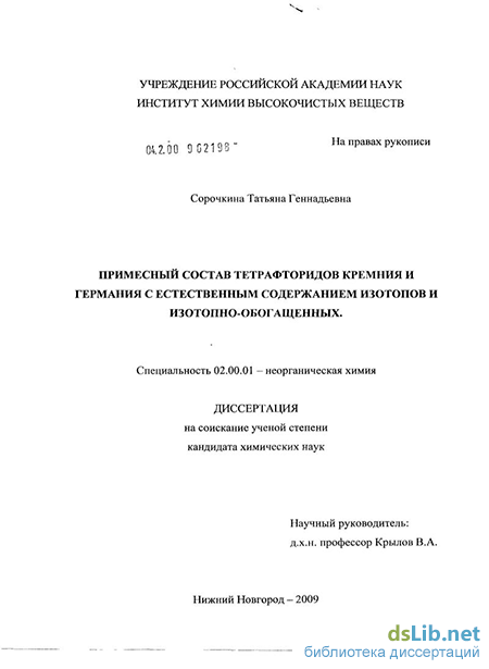 Личный вклад. Автор участвовала в постановке цели и задач исследований, планировании и проведении экспериментальных работ по изучению примесного состава SiF4 и GeF4 с естественным содержанием изотопов и изотопно-обогащенных: создании установок, проведении идентификации примесей, разработке методик количественного определения углеводородов и гексафторида серы в SiF4 и GeF4, гексафтордисилоксана в SiF4 методом газовой хроматографии, определении содержания примесей после синтеза, очистки и изотопного обогащения, изучении поведения примесей в процессах очистки и изотопного обогащения SiF4 и GeF4, проведении эксперимента по изучению происхождения примесей углеводородов в тетрафториде кремния, анализе, обработке и обобщении полученных результатов, формулировании выводов.