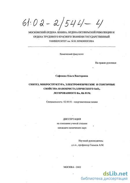 Сафонова Ольга Викторовна. Синтез, микроструктура, электрофизические и сенсорные свойства нанокристаллического SnO2 , легированного Ru, Rh и Pd : диссертация ... кандидата химических наук : 02.00.01.- Москва, 2002.- 173 с.: ил. РГБ ОД, 61 02-2/544-4