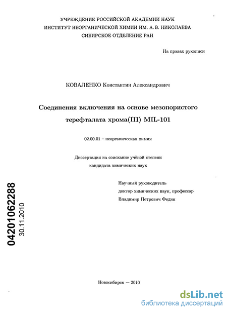Научная новизна. В рамках проведённых исследований впервые были получены и охарактеризованы набором физико-химических методов соединения включения на основе мезопористого терефталата хрома (III) Cr-MIL-101 и наноразмерных кластеров переходных металлов.