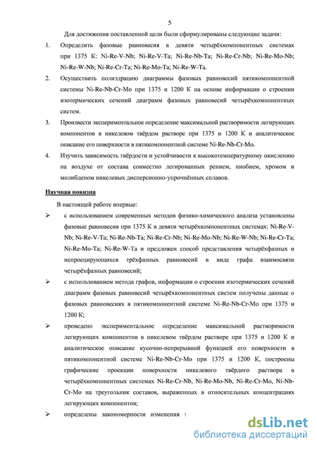 с использованием метода графов, информации о строении изотермических сечений диаграмм фазовых равновесий четырёхкомпонентных систем получены данные о фазовых равновесиях в пятикомпонентной системе Ni-Re-Nb-Cr-Mo при 1375 и 1200 К;