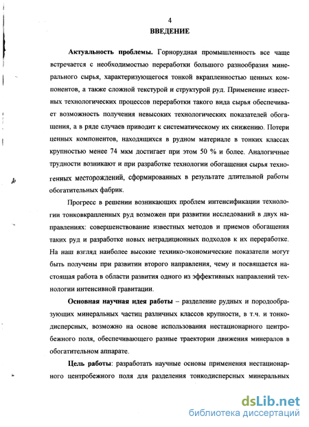 щий теоретические выводы и обобщения, лабораторные и полупромышленные испытания. Применены анализ и обобщение литературных и фондовых материалов, лабораторные исследования условий разделения рудных и породообразующих минералов в нестационарном центробежном поле, теория планирования эксперимента, рентгено-спектральный метод анализа продуктов обогащения, обработка результатов исследования с использованием закона нормального распределения, оптимизация условий разделения минералов с применением многофакторного планирования эксперимента, математическое моделирование процесса с применением ЭВМ. Научные положения, выносимые на защиту: