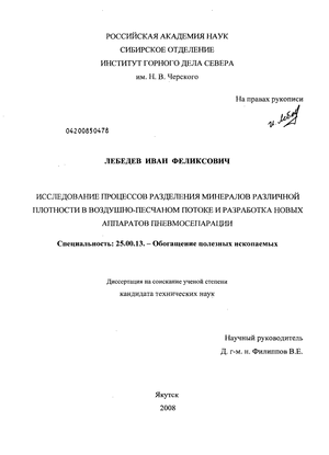Личный вклад автора: Проведение исследований процессов разделения минеральных частиц различной плотности и крупности в воздушном и воздушно-песчаном потоке в зависимости от режимных и конструктивных параметров аэродинамических установок, обработка и анализ полученных экспериментальных данных, разработка конструкций лабораторных пневматических аппаратов для сухого обогащения минералов высокой и средней плотности. Руководство испытаниями опытного промышленного пневмосепаратора ПОС-2000. Участие в модернизации центробежного пневматического сепаратора, разработка, изготовление и испытание винтового пневмосепаратора.