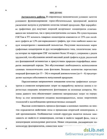 Актуальность работы. В современных экономических условиях залогом успешного функционирования горно-обогатительных предприятий является увеличение выпуска и улучшение качества готовой продукции. При переработке графитовых руд получают широкий ассортимент концентратов отличающихся как зольностью, так и гранулометрическим составом. По существующим ГОСТам и ТУ зольность товарных концентратов изменяется от 25% для литейного графита до 1,5% для карандашного графита, при этом наиболее важен выпуск концентратов с наименьшей зольностью. Получение малозольных марок графитовых концентратов из руд метаморфического типа, геологические запасы которых на территории СНГ составляют более 10 млрд т, сопряжено с рядом трудностей, что обусловлено низкой массовой долей графита в руде, различной его флотационной активностью и присутствием природно-гидрофобных минералов вмещающей породы. Это обусловливает необходимость использования сложных технологических схем флотации. Большое количество перечистных операций флотации (до 13 - 24) и операций до измельчения (до 4-6) предопределяет высокую себестоимость выпускаемой продукции.