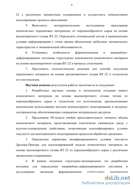 Идентифицировать параметры модифицированного условия текучести Друкера-Прагера композитного материала, на основе высокопрочного сплава ВТ-22 с различным процентным содержанием и осуществить компьютерное моделирование процесса прессования.