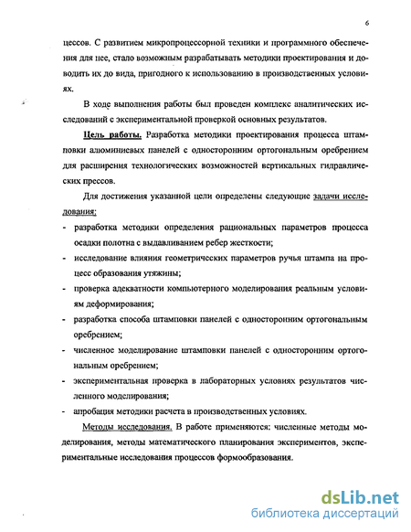 Для достижения указанной цели определены следующие задачи исследования: разработка методики определения рациональных параметров процесса осадки полотна с выдавливанием ребер жесткости; исследование влияния геометрических параметров ручья штампа на процесс образования утяжины; проверка адекватности компьютерного моделирования реальным условиям деформирования; разработка способа штамповки панелей с односторонним ортогональным оребрением; численное моделирование штамповки панелей с односторонним ортогональным оребрением; экспериментальная проверка в лабораторных условиях результатов численного моделирования; апробация методики расчета в производственных условиях.