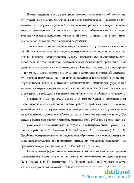 Познавательные процессы лежат в основе обучения и обуславливают выбор необходимых методов и приёмов работы. Проблема развития познавательной активности в различных аспектах рассматривалась в трудах философов, педагогов, психологов. Сложное диалектическое взаимодействие субъекта и объекта в процессе познания, активная роль субъекта в познании и сохранение следов этой активности в готовом сложившемся знании рассматривается в работах B.C. Грязнова, И.Я. Лойфмана, А.Н. Ракитова (121, с. 41). Проблеме совершенствования содержания образования на основе оптимизации, интеллектуализации и развития мышления учащихся, овладения ими грамотностью уделял внимание А.Н. Ростовцев (121, с. 42).